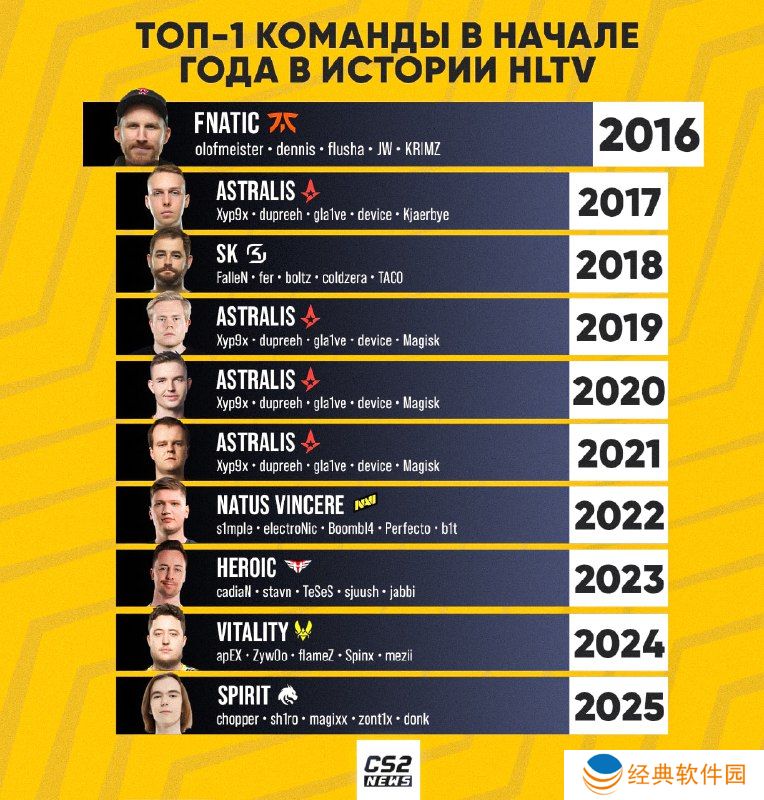 近日,有俄罗斯媒体统计了自2016年以来,以HLTV世界第一身份开启新的一年征程的队伍们。其中,Astralis在年初以头名身份开局的次数最多。而今年伊始,Spirit战队赶超