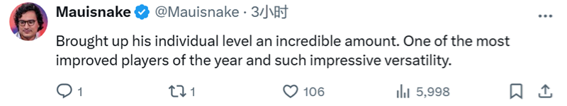 Mauisnake:他把个人水平提升到了令人难以置信的程度。他是今年进步最大的选手之一,而且他的全能让人印象深刻。