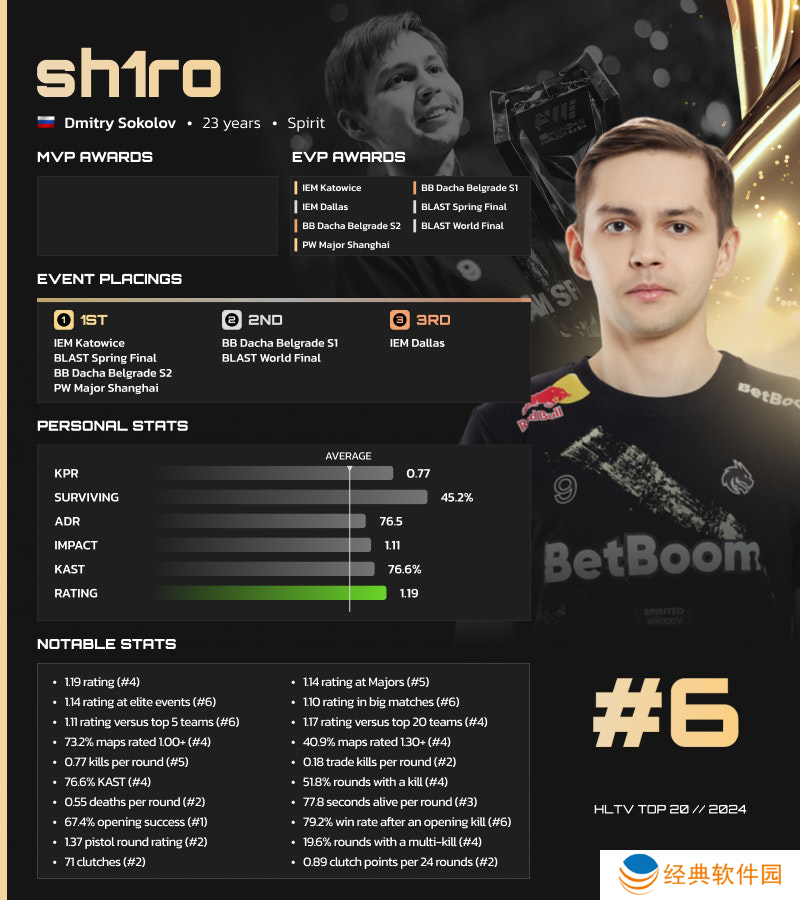 Dmitry Sokolov | sh1ro凭借出色的数据和堪称巅峰的表现,作为Spirit队内的第二明星选手赢得了许多个人荣誉,在2024年Top 20选手榜单中位列第6位。