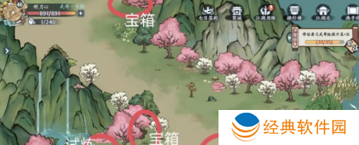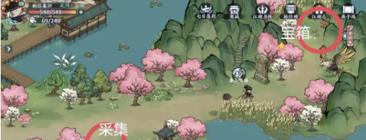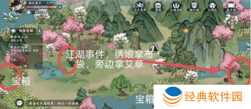 6、宝箱9、宝箱10位置,江湖事件绣娘拿布袋,旁边拿艾草