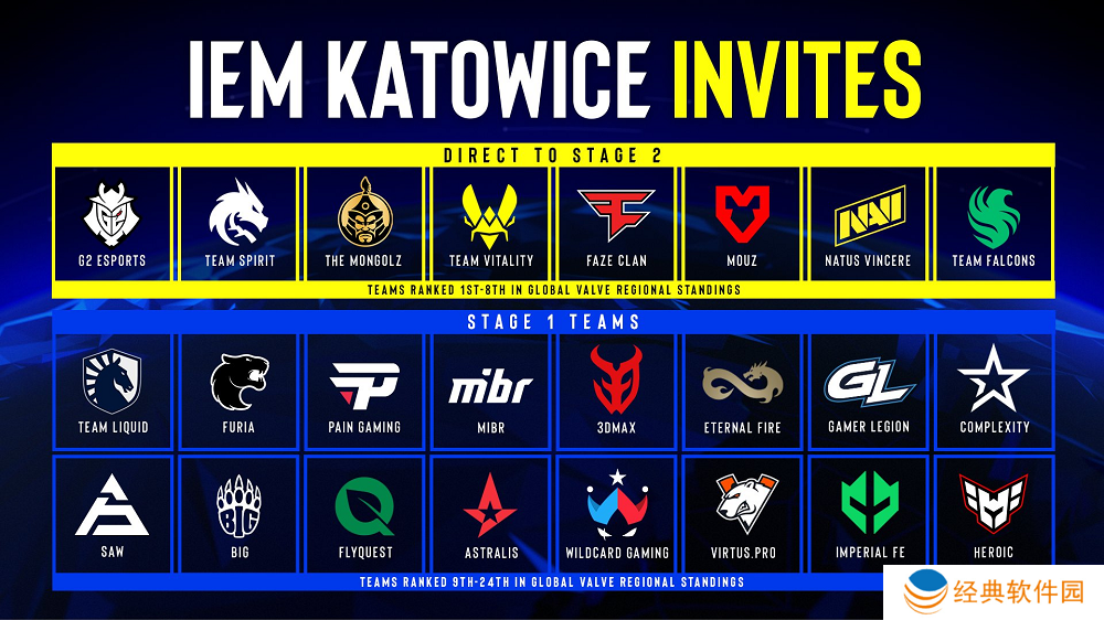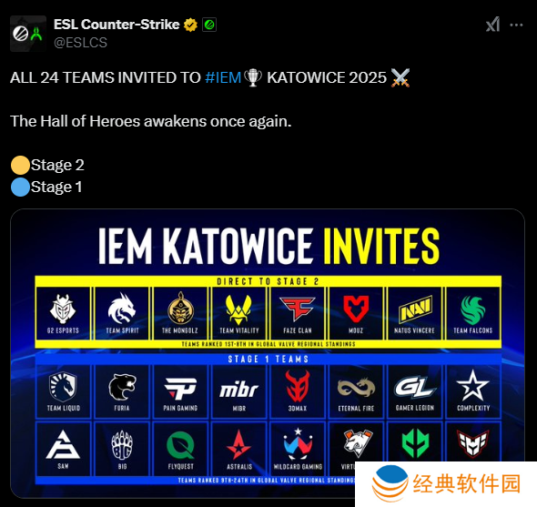 刚刚,赛事主办方ESL公布了IEM 卡托维兹2025的24支直邀战队名单。比赛将分为两个阶段,24支队伍中排名前8的队伍将直邀正赛阶段,而剩余16支队伍将从入围赛(Play-in阶段)打起。