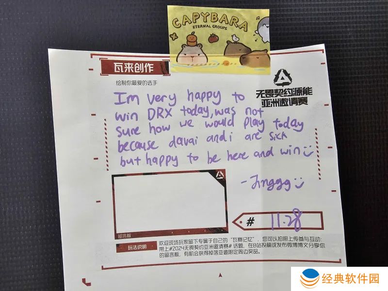 在无畏契约源能亚洲邀请赛中,PRX战胜DRX挺进胜者组。赛后,Jinggg在纸板上写道:我不确定今天我们能打成什么样,因为d4v41和我都生病了,能赢下DRX我很高兴。