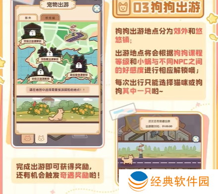 3、出游地点解锁:根据狗狗课程的等级以及小蜗和不同NPC之间的好感度进行解锁。