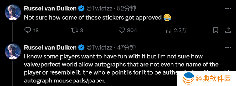 Twistzz随后重申了V社当初的规定:“V社在给选手的指南中说,您的贴纸必须像您的亲笔签名,并在5-10秒内完成。我并不是在责怪选手,但对我来说,如果第一眼看到的贴纸与选手的ID不相似,那么我认为它就不应该被接受。关键在于V社是否认同这样的签名。”