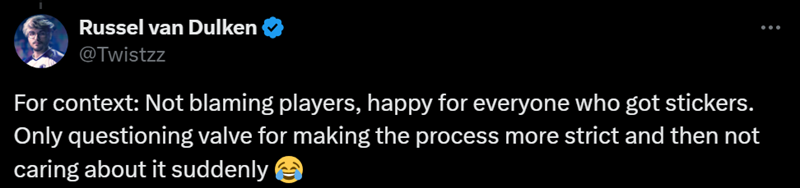 “请注意发文背景: 不是责怪选手,为每个拿到贴纸的人感到高兴。只是质疑V社之前严控流程,然后又突然不管不顾。”