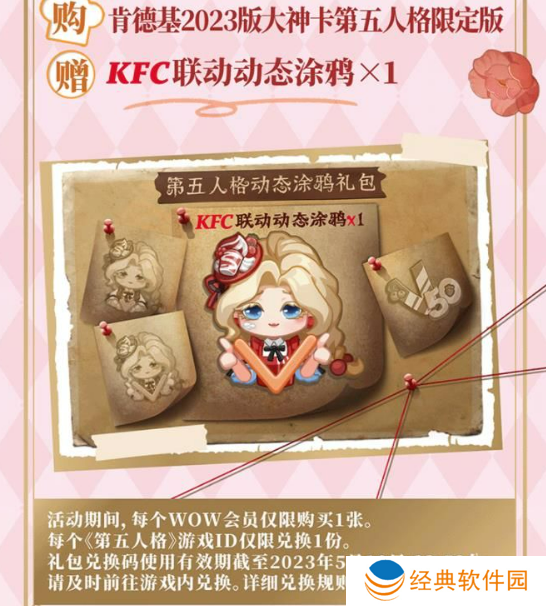 九、开通【肯德基2023版大神卡第五人格限定版(90天)】后,可在“第五人格”微信公众号或《第五人格》游戏内兑换“第五人格动态涂鸦礼包”1份。用户可于2023年5月10日23:59之前前往大神卡主题页【专享福利】权益池查看对应权益,点击“立即领取”可前往WOW会员卡包查看“第五人格动态涂鸦礼包”兑换券1张。兑换券使用有效期截至2023年5月10日23:59。在使用有效期内,关注“第五人格”微信公众号,点击底部菜单【事务所】后选择【许愿兑换】即可进入兑换页面,按页面提示使用兑换码兑换礼包;或登录《第五人格》游戏,进入许愿单页面,按页面提示使用兑换码兑换礼包。活动期间,每个《第五人格》游戏ID仅限兑换1份“第五人格动态涂鸦礼包”。“第五人格动态涂鸦礼包”权益由《第五人格》游戏提供,权益具体内容说明及使用规则以游戏平台官方公示为准。