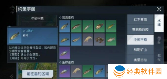 2、在钓鱼手册的中部平原、科勒矿山、金色沙漠中找到大口黑鲈,然后点击左下角的【前往垂钓区域】;
