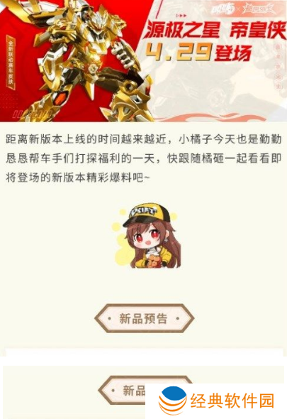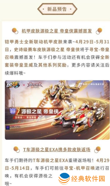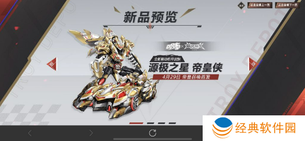 《QQ 飞车手游》宣布与铠甲勇士合作,史诗级赛车皮肤源极之星帝皇侠将于 4 月 29 日-5 月 31 日推出,官方还放出了首段 CG。玩家参与活动还有机会获得全新套装帝皇圣威及其他系列奖励。