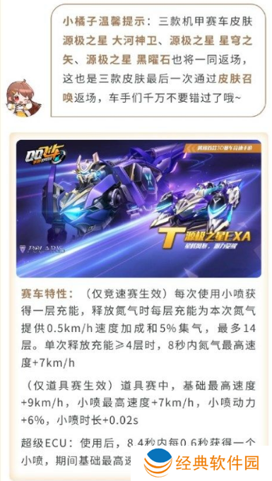 从官方活动获取到,《QQ 飞车手游》将在 4 月 25 日开启全新特洛伊熔炉盛典主题版本,多款皮肤在 4 月 29 日-5 月 14 日返场,包括 T 车源极之星 EXA、源极之星 大河神卫、源极之星 星穹之矢、源极之星 黑曜石。
