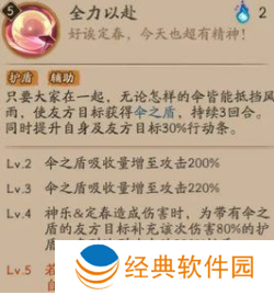 给一个友军目标提供伞之盾,持续3回合。同时提升自己和该友军目标的30%行动条。