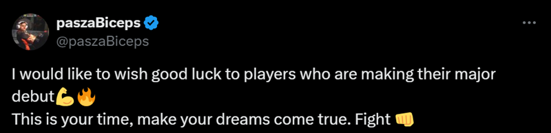 今天上海Major揭幕战阶段将会正式打响,参赛队伍将会为自己的Major梦想而战。pashaBiceps也在社交平台上分享了自己的祝福。