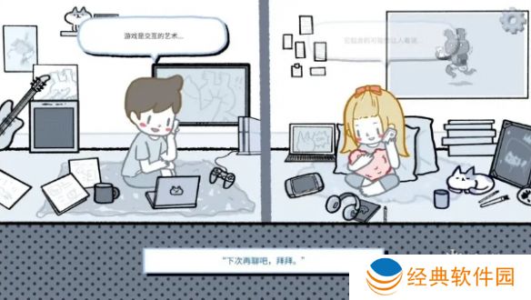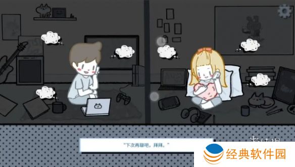 8、进入下一个场景中点两个人共同有的东西游戏机、手柄、吉他、耳机和两只猫咪。拉近手机屏幕,把屏幕拉黑出现三朵白云。