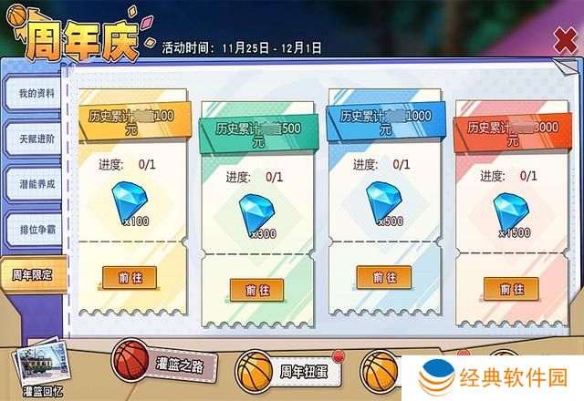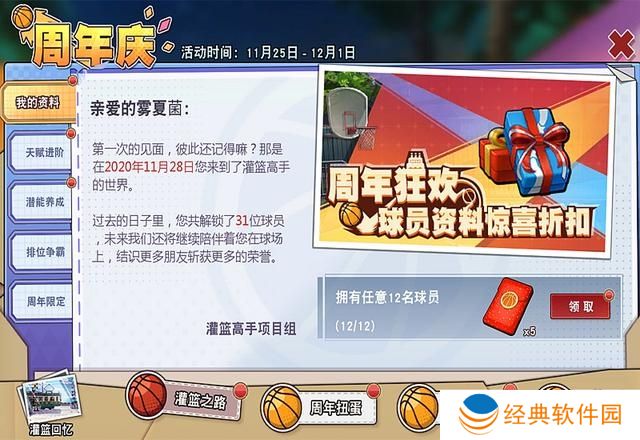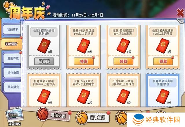 先看一下周年庆的主界面,横向有四大类,然后还夹杂了一个“灌篮回忆”。这个灌篮回忆也是有奖励的。而【灌篮之路】囊括了我的资料、天赋进阶、潜能养成、排位争霸、周年限定五小类。