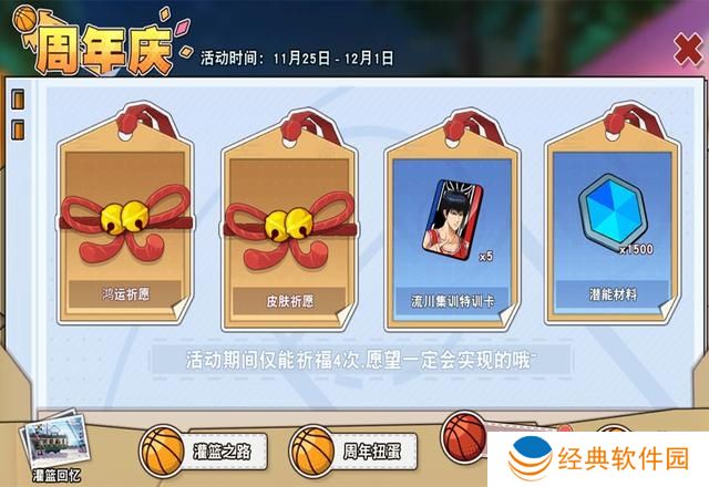 【周年祈福】也是属于必定会拿到的奖励,四个选项,鸿运祈愿是1205蓝钻、15000篮球币、15000竞技币、15000社团币四选一。皮肤祈愿是湘北、翔阳、陵南的球员训练服任选其一或者是40张皮肤属性变更卡。