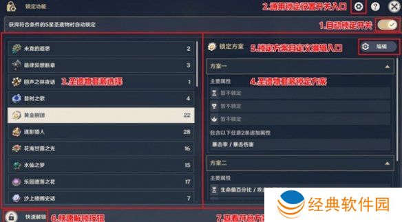 原神在4.3版本上线了新版的锁定圣遗物功能,但是很多小伙伴并不会使用该功能,不知道如何将圣遗物套装锁定关闭,接下来小编便为大家提供圣遗物套装锁定关闭方法,一起来看看吧。