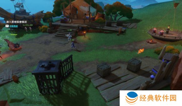 7、之后需跟随指引前往对方活动的区域进行侦察,到达后先打开笼子,然后在将热气球炸毁。