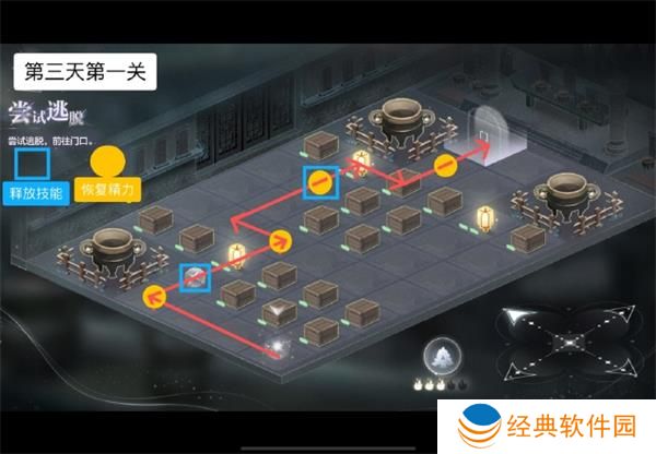1.世界之外渡见春尝试逃脱路线走法如下: