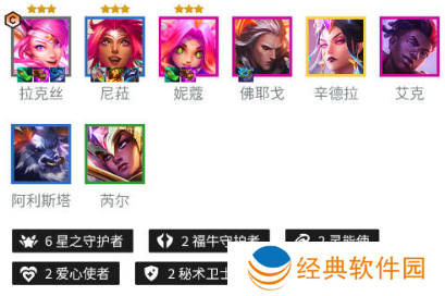 2、阵容羁绊:6星之守护者+2福牛守护者+2灵能使+2爱心使者+2秘术卫士。