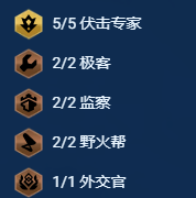 2、羁绊组成:5伏击2执法2野火帮2监察1外交官