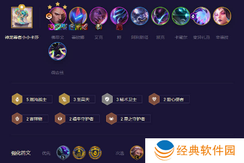 2、阵容羁绊:5混沌战士+3至高天+3秘术卫士+2爱心使者+2吉祥物+2福牛守护者+2星之守护者。