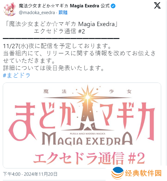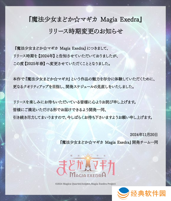 Aniplex 2024年11月20日宣布,根据动画《魔法少女小圆》改编的全新手游《魔法少女小圆 Magia Exedra》(PC / iOS / Android)的推出时程,将从原先的 2024 年更改为 2025 年春季。
