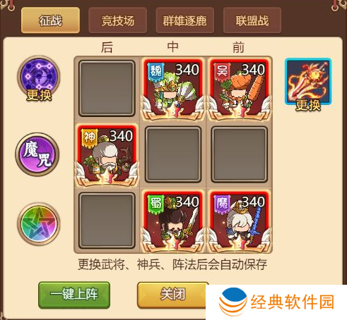 防守方面:神华佗的复活能防止刘备过早被敌方击杀,孙权能让造成暴击伤害时恢复血量以保证血量的健康,魔张辽与司马懿攻击附带负面效果进一步削弱敌方战力。