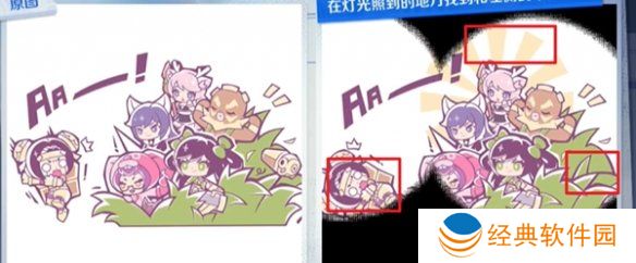 4、人物后面的背景不同、右侧最左边人物的姿势错误、草丛上缺少物品。