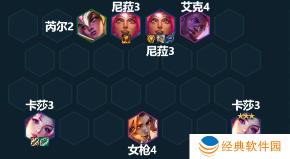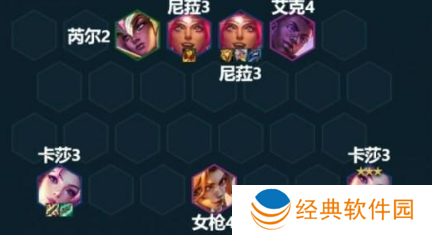 2.没有拿到芮尔-坚守防线的情况下,升7人口后攒钱慢D三星卡莎和三星的尼菈。 因为在这种情况下,一般会使用尼菈作为主t,7人口搜三费卡的概率为35%,和8人口并列最高。