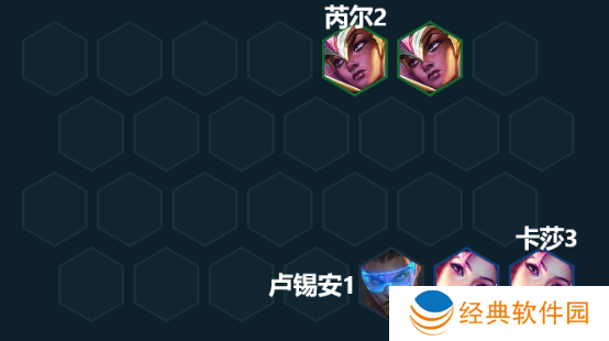 如果前期第一个强化就已经拿到了好事成双的话,就可以上两个芮尔+两个卡莎,开出2星守羁绊,再补一个卢锡安或者EZ来凑2迅射。