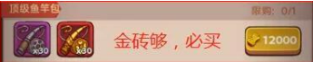 12000金砖换30金鱼竿和30银鱼竿,在普通的黑市中30金鱼竿就要12000金砖了,这里还多送30银鱼竿,是非常划算的。购买后的金鱼竿需要规划好使用,需要完成一轮的月度活动再使用,才能性价比最高。只要我们的金砖够,我们就必买。