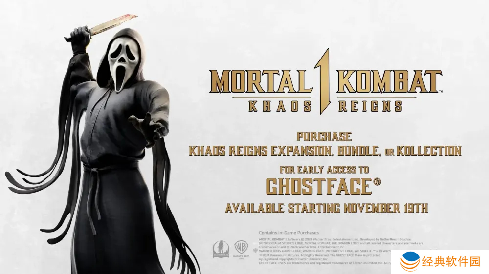 华纳兄弟游旗下 NetherRealm 工作室制作,目前贩售中的老牌对战格斗游戏最新作《真人快打 1(Mortal Kombat 1)》(PS5 / Xbox Series X|S / Switch / PC),日前公开了第 2 波追加角色包「格斗包 2」所收录之电影《惊声尖叫(Scream)》系列跨刀参战角色「鬼面(Ghostface)」的前导预告片与对战短片。
