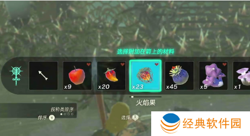 2、因为是下雪天,所以我们使用火焰果也是可以的,将火焰果附加在箭上面,然后射出去的箭就有了燃烧的作用。