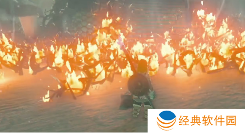 3、对准这些荆棘处,然后将附加了火焰果的箭射进去,这周围就是都会燃烧起来,等待烧完有了路就行了。
