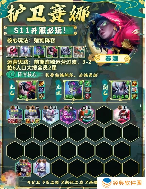 金铲铲之战s11护卫赛娜怎么玩?金铲铲之战s11护卫赛娜阵容怎么搭配?下面小编给大家整理了金铲铲之战s11护卫赛娜阵容推荐攻略,快来看看吧!