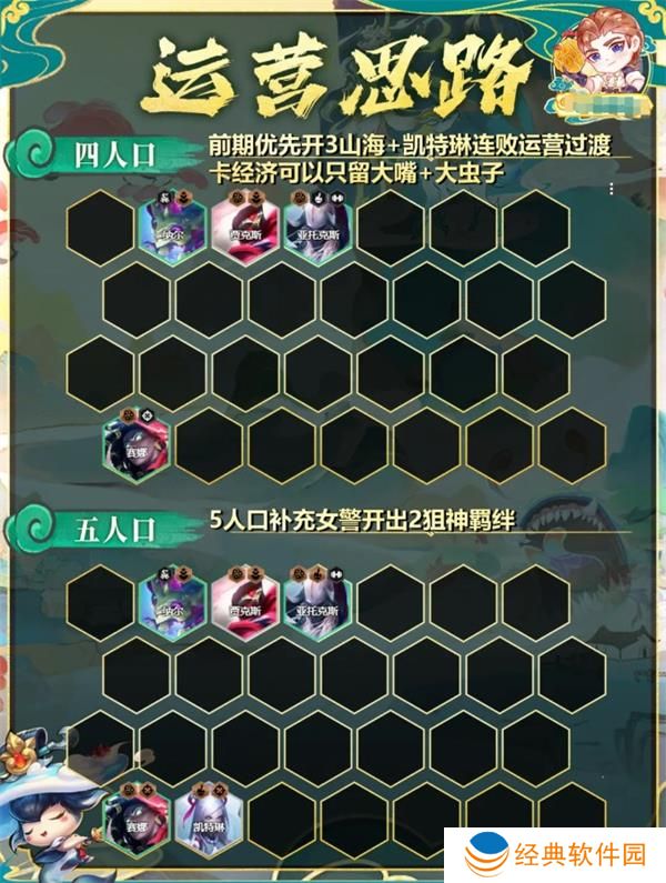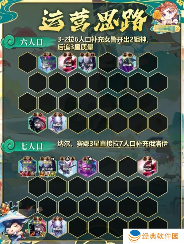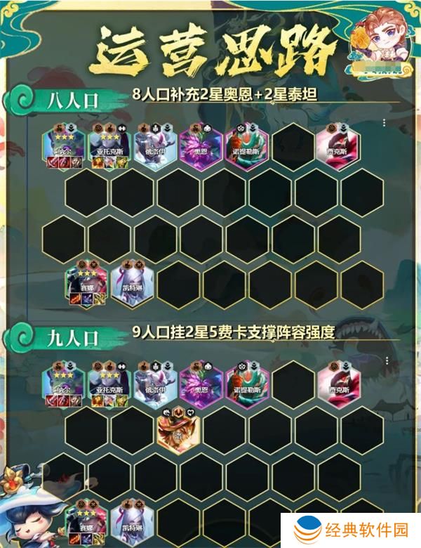 护卫转→剑魔/贾克斯,7人口补充俄洛伊或者阿木木开出4护卫羁绊,8人口补充莫甘娜开出4幽魂
