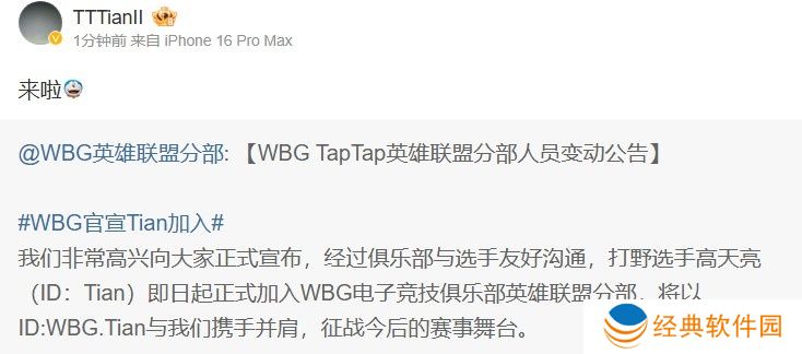 直播吧12月4日讯 WBG官宣了打野选手Tian的加盟,Tian选手转发官宣微博,并配文:来啦~