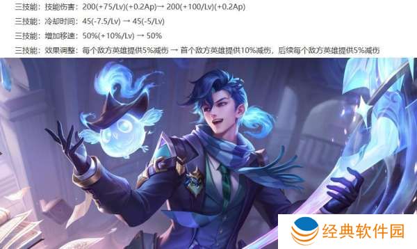 老夫子削弱:被动前期真伤增加,后期真伤降低,1技能的前期伤害降低,2技能的前期减速效果降低,大招的前期伤害降低,后期伤害增加。