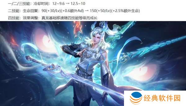 敖隐削弱:1/2/3技能的CD增加0.5~0.4秒,2技能的前期回血增加,且回血改为额外生命加成,4技能真龙的移速随技能等级变化。
