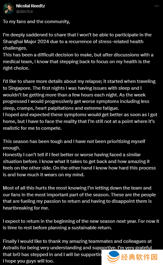 我非常遗憾地通知大家,由于压力相关的健康问题复发,我将无法参加2024年上海Major。这是一个艰难的决定,但经过与医疗团队的讨论,我知道专注于我的健康是正确的选择。