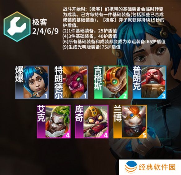 己方每持有一件基础装备(包括那些已合成成装的基础装备),【极客】弈子就获得持续15秒的护盾值。