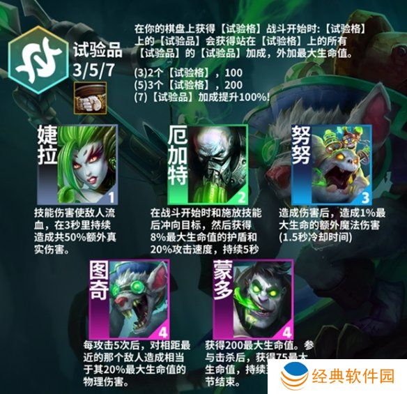在你的棋盘上获得【试验格】战斗开始时:【试验格)上的【试验品】会获得站在【试验格】上的所有【试验品】的【试验品】加成,外加最大生命值。