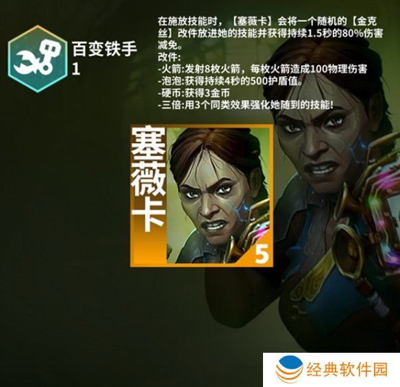 在施放技能时,【塞薇卡】会将一个随机的【金克丝】改件放进她的技能并获得持续1.5秒的80%伤害减免。