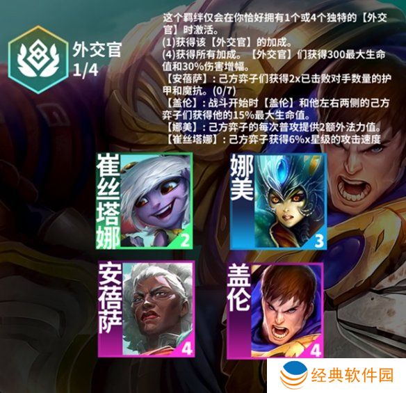 这个羁绊仅会在你恰好拥有1个或4个独特的【外交官】 时激活。