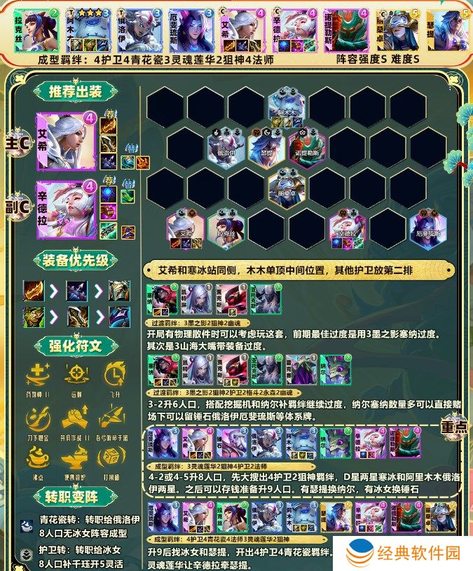 1.成型羁绊:4青花瓷4护卫4法师3灵魂莲华2狙神