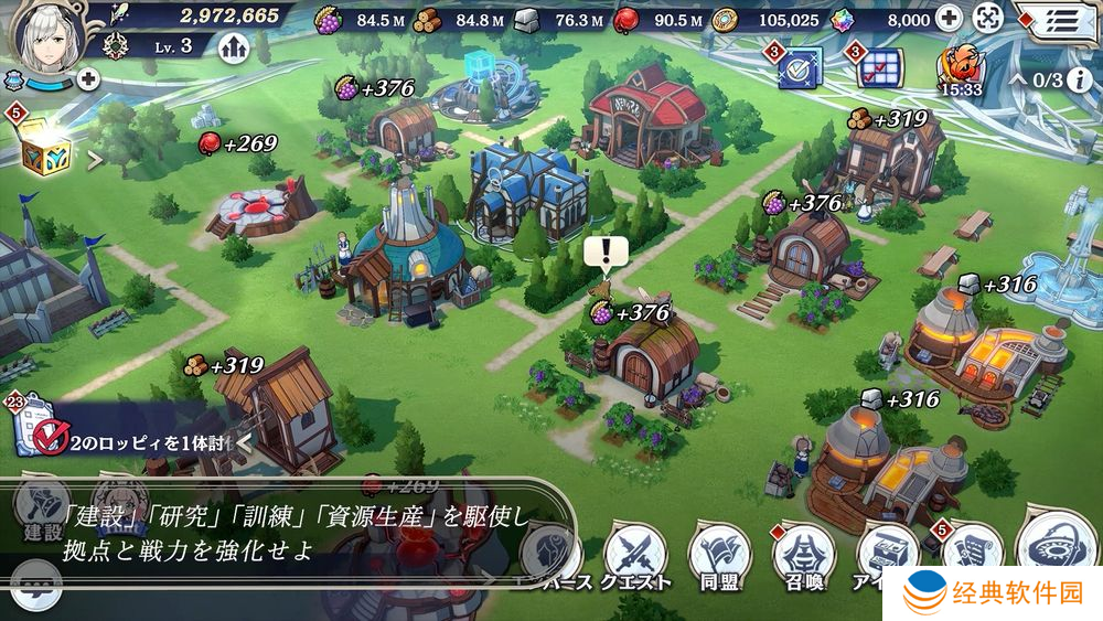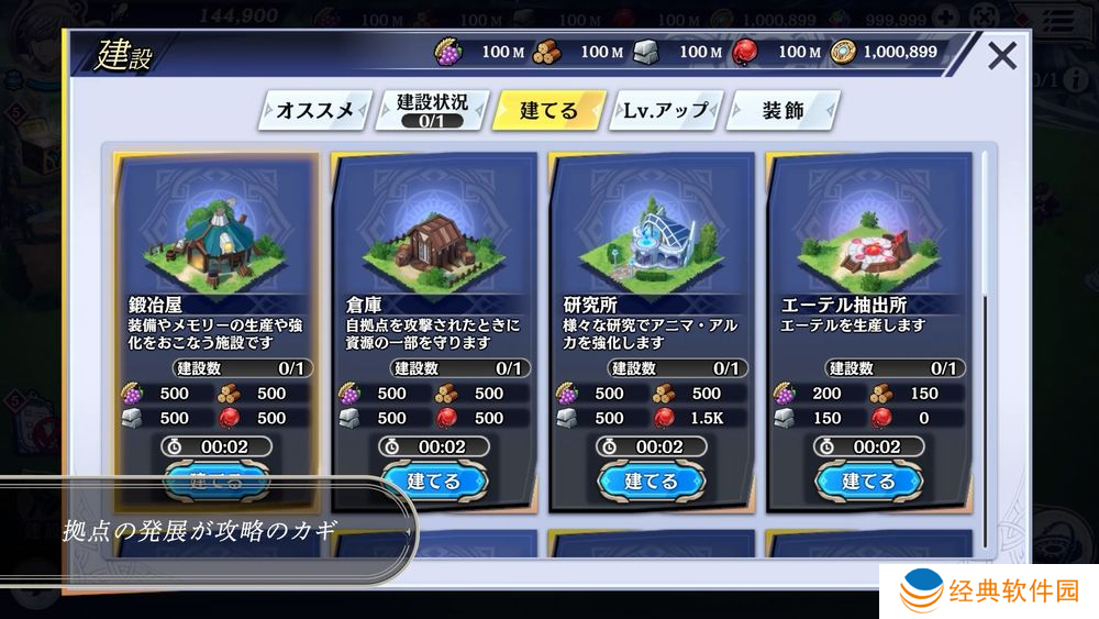 作为玩家据点的空中都市「阿**・阿尔加(アニマ・アルカ)」。善用「建设」、「研究」、「训练」、「资源生产」来发展设施以及强化战力,是在试炼大地「炼狱」中生存的关键。