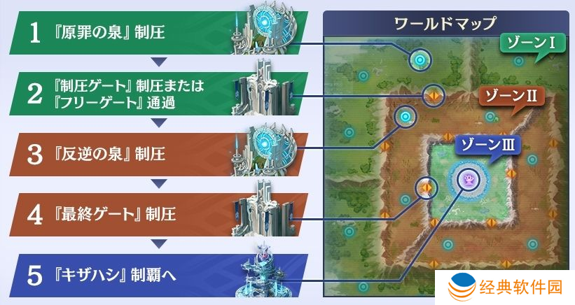 玩家须以压制位于各区域内的「原罪/叛逆之泉」为目标。压制泉的其中一个奖励,是有权挑战可移动至下一区域的「区域大门」,对于以塔(キザハシ)为目标的玩家来说是重要设施。除此之外,攻下泉时获得的「压制能力」,可强化全体同盟。