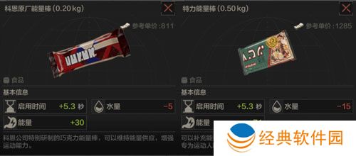 再看看能量棒“特力牌”PK“科恩原厂”,其他属性接近,但“特力”贵了50%,能量多136%,美中不足的是扣水较多。在饮料充足的情况下,建议是优先选择属性相对较高的食物。毕竟突围过程瞬息万变,补给不到位,物资就白给~
