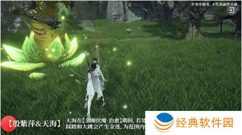 2、殷紫萍+天海,触发连携机制,天海使用金刚伏魔·治愈,踩踏和大跳会产生“步步生莲”,为范围内的队友提供生命回复。