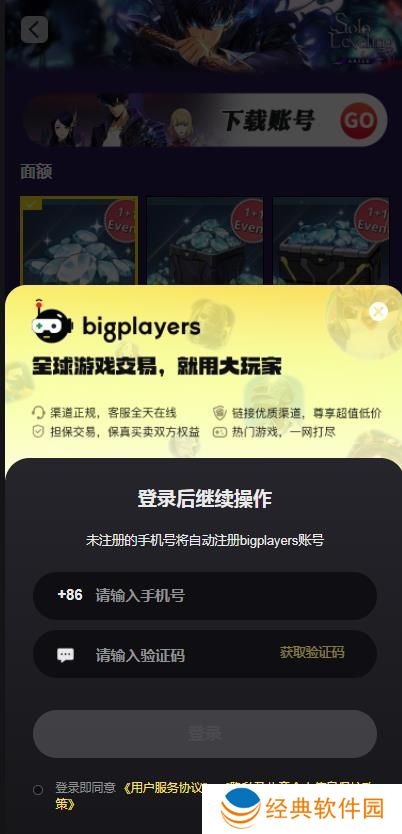 2.这时即为提示用户需要进行登录你的bigplayers账号,对于新用户来说,只需要输入手机号、短信验证码即可注册并登录成功。