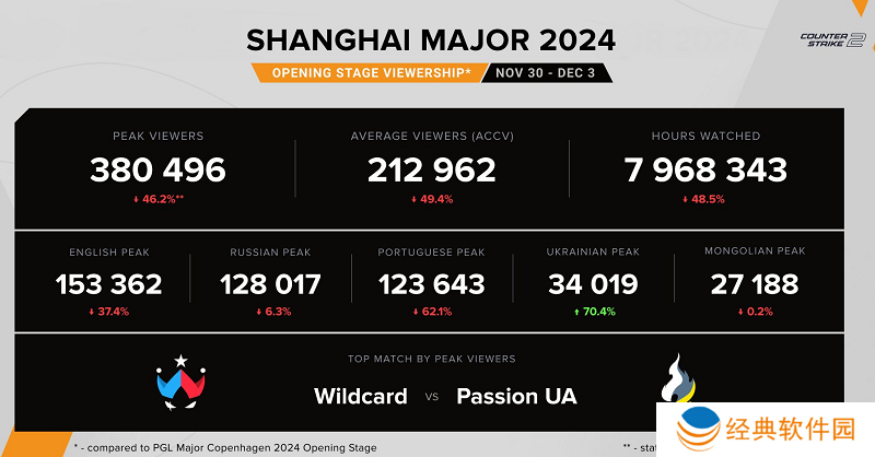 从统计数据来看,2024上海Major的观赛人数明显落后于上届哥本哈根Major。与2024哥本哈根Major相比,上海Major总观赛人数下降了一半,部分语言的收视率较上届高峰下降了60%以上。